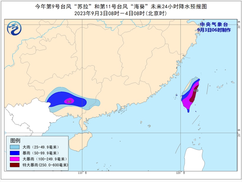 降水預(yù)報(bào):9月3日08時(shí)至4日08時(shí),受“蘇拉”和“??庇绊?,廣西中南部、廣東西南部、臺(tái)灣島等地部分地區(qū)有大到暴雨,其中,廣西中南部、臺(tái)灣島中東部等地部分地區(qū)有大暴雨,臺(tái)灣島東部部分地區(qū)有特大暴雨(250-600毫米)。