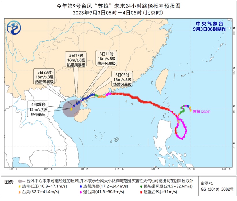 大風(fēng)預(yù)報(bào):9月3日08時(shí)至4日08時(shí),受“蘇拉”影響,北部灣、瓊州海峽以及廣西南部沿海、海南島北部沿海等地將有6-7級(jí)大風(fēng),其中北部灣部分海域?qū)⒂?級(jí)、陣風(fēng)9-10級(jí)的大風(fēng);受“??庇绊?,巴士海峽、臺(tái)灣海峽、臺(tái)灣以東洋面、東海南部及釣魚(yú)島附近海域以及浙江南部沿海、福建沿海、臺(tái)灣島沿海將有6-8級(jí)、陣風(fēng)9-10級(jí)大風(fēng),部分海域或地區(qū)的風(fēng)力有9-12級(jí),陣風(fēng)13-14級(jí),“??敝行慕?jīng)過(guò)的附近海面或地區(qū)的風(fēng)力有13-16級(jí),陣風(fēng)17級(jí)。