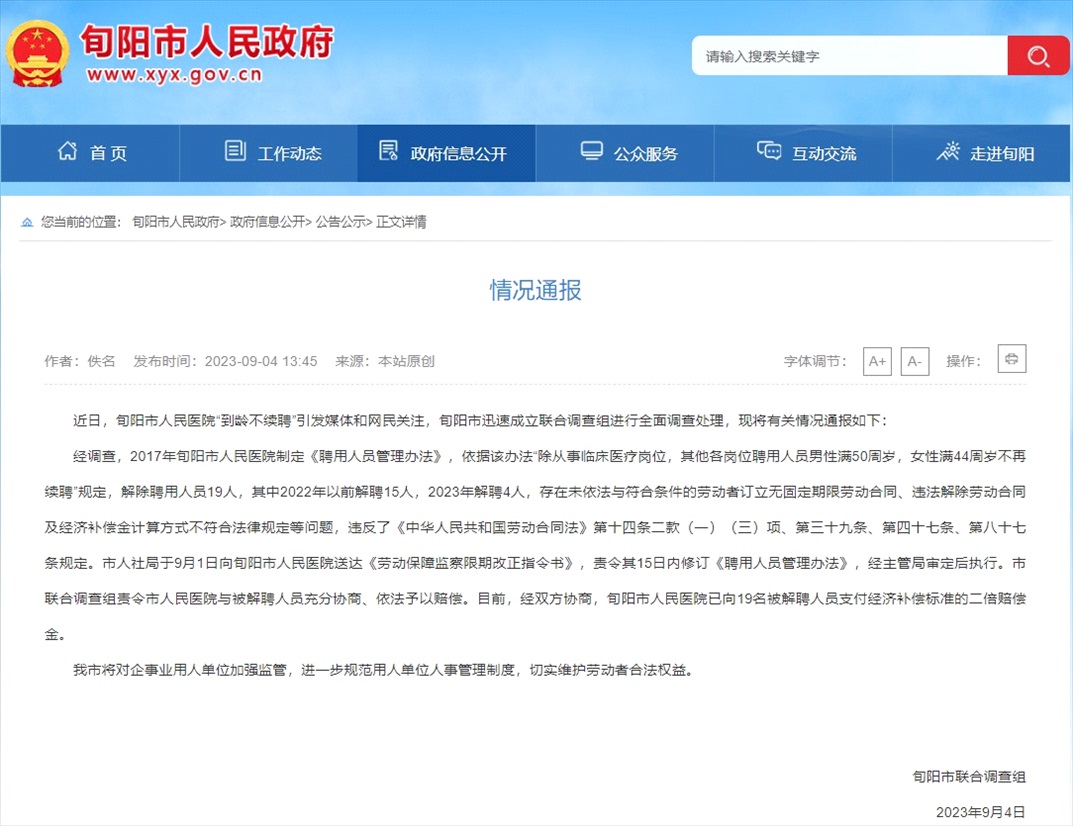 ·陜西旬陽一醫(yī)院規(guī)定“到齡不續(xù)聘”,旬陽市政府回應(yīng):責(zé)令限期改正,支付兩倍賠償。