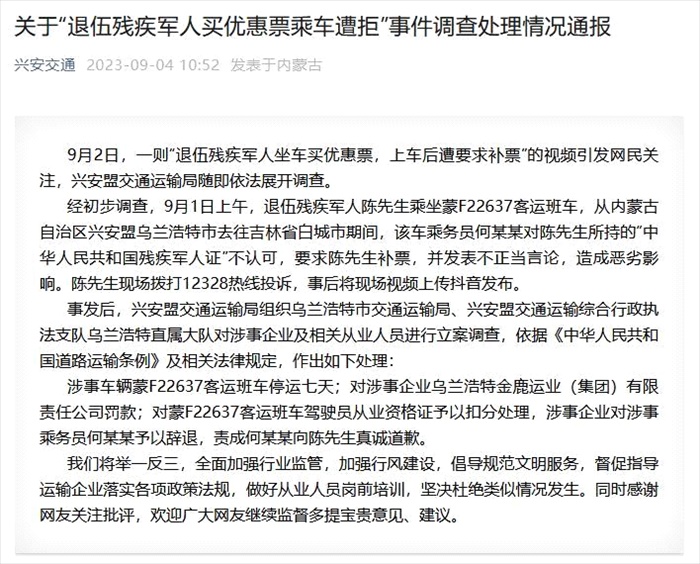 ·興安盟交通運(yùn)輸局通報(bào)“退伍殘疾軍人買優(yōu)惠票乘車遭拒”:涉事乘務(wù)員被辭退。