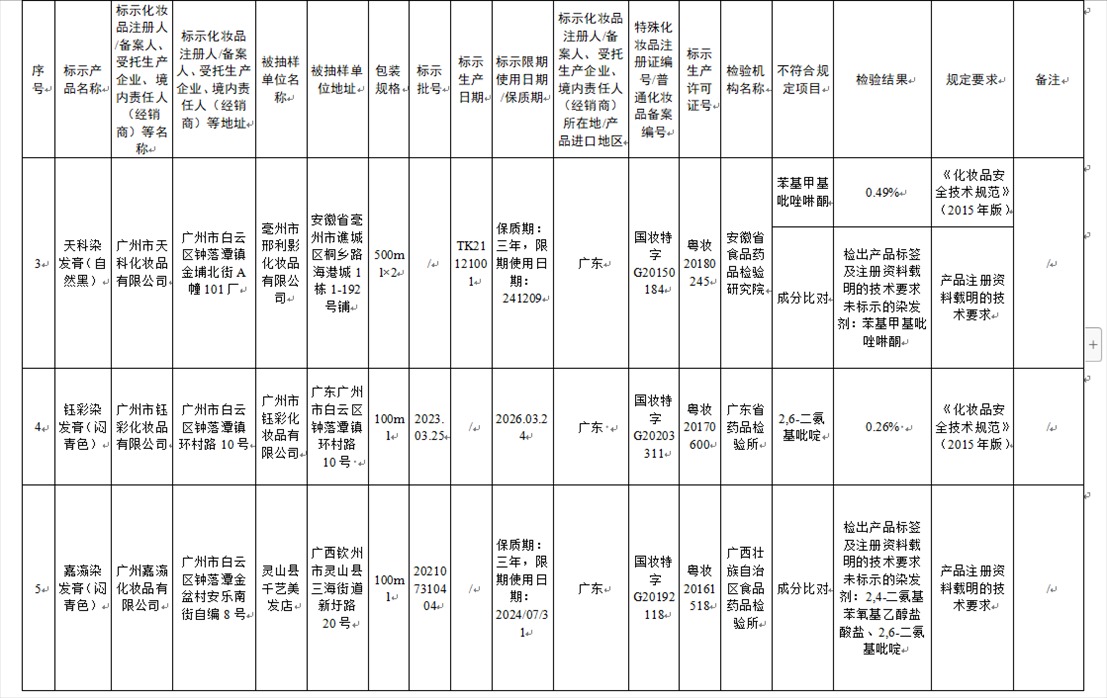 國(guó)家藥監(jiān)局網(wǎng)站今天發(fā)布通告稱,在2023年國(guó)家化妝品抽樣檢驗(yàn)工作中,經(jīng)重慶市食品藥品檢驗(yàn)檢測(cè)研究院等單位檢驗(yàn),產(chǎn)品標(biāo)簽標(biāo)示為廣州市天科化妝品有限公司生產(chǎn)的天科染發(fā)膏(自然黑)等23批次化妝品不符合規(guī)定(見下圖表格)。