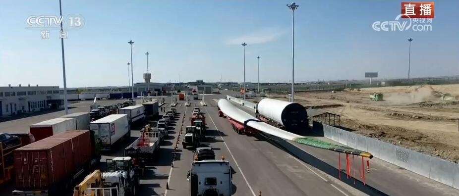 看這邊。大家知道這個(gè)龐大的家伙是什么嗎?它是風(fēng)力發(fā)電機(jī)上的一個(gè)扇葉。根據(jù)不同型號,短的扇葉有三四十米,長的有七八十米,龐大的塊頭也讓它在出口貨物中格外亮眼。它的這種“出”,出的不僅僅是設(shè)備,還有帶著“中國技術(shù)”的風(fēng)電項(xiàng)目。中亞地區(qū)有非常豐富的風(fēng)力資源,來自中國的風(fēng)電項(xiàng)目、風(fēng)電技術(shù)正全面助力共建“一帶一路”國家的綠色能源發(fā)展。當(dāng)?shù)卣秃jP(guān)還專門將出境通道拓寬了半米,讓這種超寬、超長的大型設(shè)備能夠順利出境。