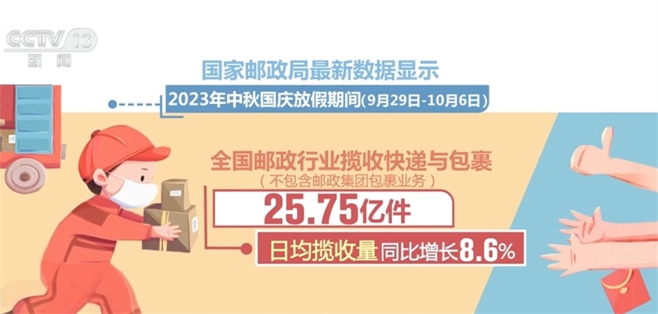 國家郵政局最新數(shù)據(jù)顯示,今年中秋國慶放假期間,全國郵政行業(yè)攬收快遞與包裹25.75億件,日均攬收量同比增長8.6%;投遞快遞與包裹25.72億件,日均投遞量同比增長18.7%。