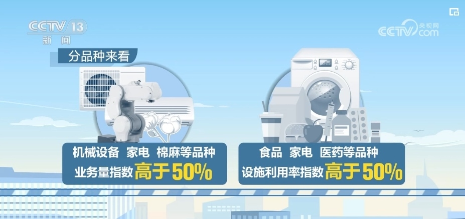 分品種來(lái)看,機(jī)械設(shè)備、家電、棉麻等品種的業(yè)務(wù)量指數(shù)高于50%;食品、家電、醫(yī)藥等品種的設(shè)施利用率指數(shù)高于50%。