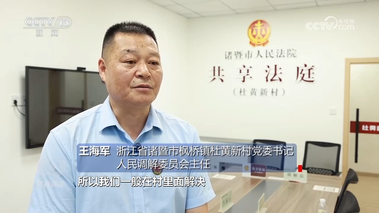 浙江省諸暨市楓橋鎮(zhèn)杜黃新村黨委書記、人民調(diào)解委員會(huì)主任王海軍:“村里一般的調(diào)解村兩委會(huì)以及村調(diào)委基本上就地解決,因?yàn)椤畻鳂蚪?jīng)驗(yàn)’矛盾不出村,所以我們一般在村里面解決。但是涉及到法律法規(guī)一塊或者有些老百姓在‘心結(jié)’上面解不開,我們就動(dòng)用共享法庭。”