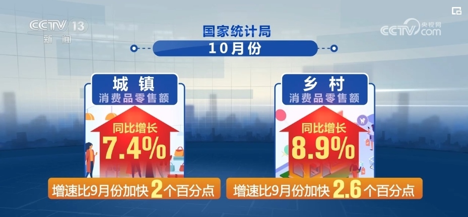 國家統(tǒng)計局最新數(shù)據(jù)顯示,在縣鄉(xiāng)消費市場基礎設施不斷完善、有效供給持續(xù)擴大等有利條件帶動下,鄉(xiāng)村市場銷售增速快于城鎮(zhèn)。10月份,城鎮(zhèn)、鄉(xiāng)村消費品零售額同比分別增長7.4%和8.9%,增速比9月份分別加快2和2.6個百分點。