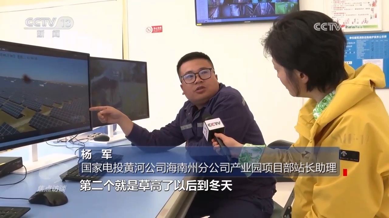 國家電投黃河公司海南州分公司產(chǎn)業(yè)園項(xiàng)目部站長助理?xiàng)钴姡骸肮夥逑旅孢@些羊,就是我們請過來幫忙除草的。因?yàn)槊磕暌坏较奶欤瑘@區(qū)電池組件下面草就特別高,長高了以后會(huì)遮擋電池組件,一個(gè)是影響發(fā)電效率,再一個(gè)秋冬季有火災(zāi)隱患?!?/p>