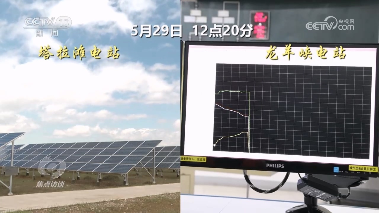 這一天,記者在龍羊峽水電站見到了水電光伏互補(bǔ)的實(shí)時(shí)情況。12點(diǎn)20分開始,50公里外塔拉灘光伏現(xiàn)場拍攝的影像顯示,有一大片云經(jīng)過光伏電站,光伏發(fā)電輸出立即發(fā)生了變化。這個(gè)數(shù)據(jù)變化實(shí)時(shí)傳到水電站的水光互補(bǔ)系統(tǒng)。