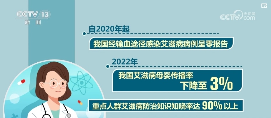 自2020年起,我國經輸血途徑感染艾滋病病例呈零報告。2022年,我國艾滋病母嬰傳播率下降至3%,重點人群艾滋病防治知識知曉率達90%以上。