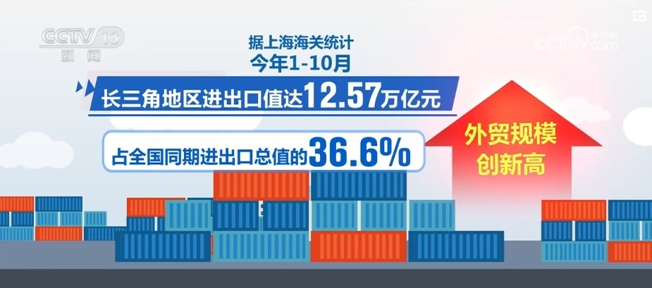 據(jù)上海海關統(tǒng)計,2023年1—10月,長三角地區(qū)進出口值達12.57萬億元,占全國同期進出口總值的36.6%,外貿規(guī)模創(chuàng)新高。