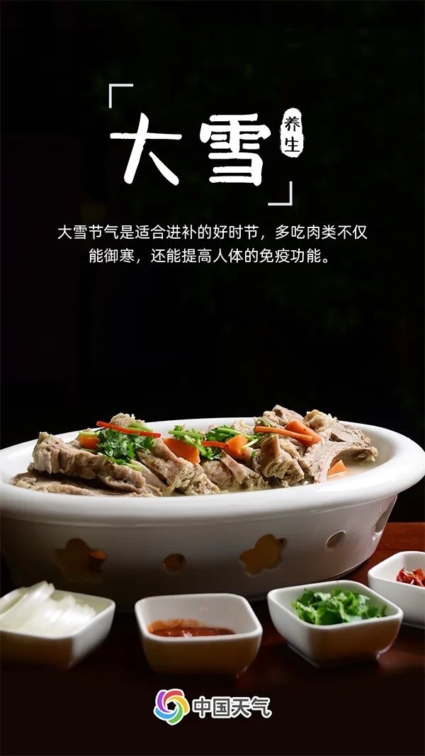 大雪也是適合進(jìn)補的好時節(jié)。冬天的寒冷為放肆吃肉提供了充足的理由,肉類不僅能為我們的身體提供足夠的熱量以抵御嚴(yán)寒,還能提高人體的免疫功能,促進(jìn)新陳代謝。不過,進(jìn)補也要有“度”,除了吃肉,也要適當(dāng)吃一些新鮮的水果和蔬菜,做到營養(yǎng)均衡。
