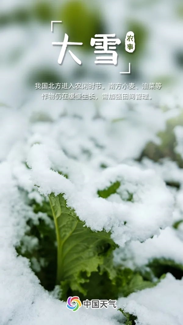 大雪節(jié)氣期間,由于氣溫進(jìn)一步下降,降雪或積雪的概率都有所增加。小雪節(jié)氣,雪隨下隨融,而到了大雪節(jié)氣,雪隨下隨積,能“坐住了”。此時,新疆北部、西北地區(qū)東部、東北等地要警惕強風(fēng)雪天氣的出現(xiàn)。