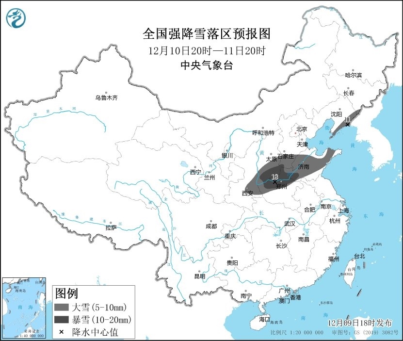 預(yù)計,12月9日20時至12月11日20時,陜西中部和北部、山西中南部、河北南部、河南北部、山東中北部、遼寧東部、吉林東南部等地的部分地區(qū)有大到暴雪,上述地區(qū)新增積雪深度5~10厘米,局地12~15厘米。主要降雪時段為10日。