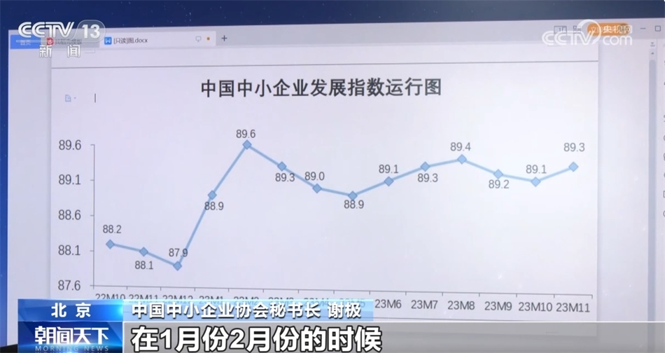 總臺央視記者 王雷:2023年的中國中小企業(yè)發(fā)展指數(shù)總體呈現(xiàn)出波浪式上升的走勢。通過對數(shù)據(jù)的分析,我們還發(fā)現(xiàn),隨著眾多中小企業(yè)加快產(chǎn)業(yè)、產(chǎn)品升級,它們的競爭力也在不斷增強。對比去年11月份和今年11月份的數(shù)據(jù),宏觀經(jīng)濟感受指數(shù)是分項指數(shù)中升幅最大的,一共上升了2.5點。