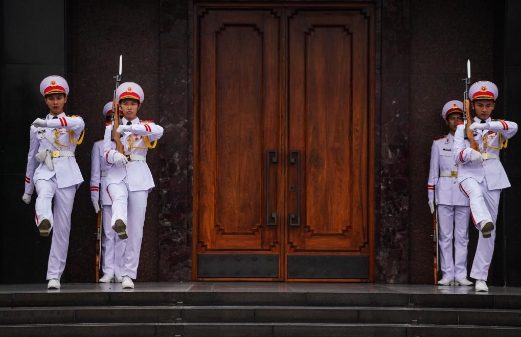 在河內(nèi)地標(biāo)巴亭廣場(chǎng)一側(cè),坐落著胡志明陵和胡志明故居。記者抵達(dá)廣場(chǎng)時(shí),守衛(wèi)胡志明陵的儀仗兵正在舉行換崗儀式,眾多民眾和游客高舉相機(jī)或手機(jī),記錄下這莊嚴(yán)肅穆的一刻。胡志明陵北側(cè)的胡志明故居內(nèi),各國游客排起長(zhǎng)隊(duì),在他曾長(zhǎng)期居住和工作的高腳屋下駐足留影。
