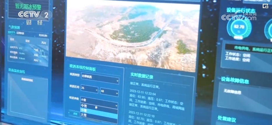 12月11日,山東各地迎來(lái)降雪天氣。在泰安肥城降雪導(dǎo)致路面結(jié)冰,工作人員通過(guò)遠(yuǎn)程啟動(dòng)路面融冰融雪系統(tǒng),保障道路安全暢通。