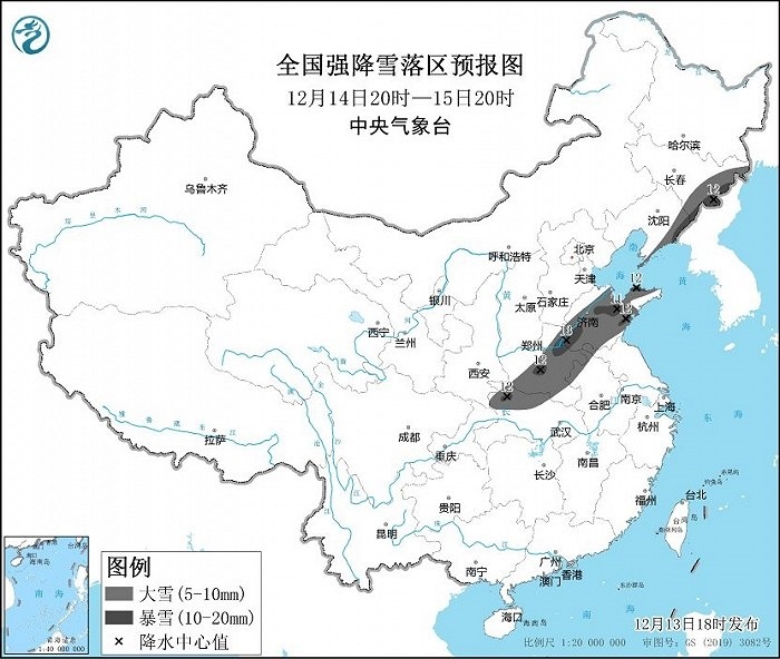 預(yù)計(jì)12月14日20時(shí)至12月15日20時(shí),湖北西北部、河南中東部、山東大部、遼寧東部、吉林東部等地有大雪,局地有暴雪(10~13毫米)。上述部分地區(qū)新增積雪深度5~10厘米,局地可達(dá)15厘米以上。