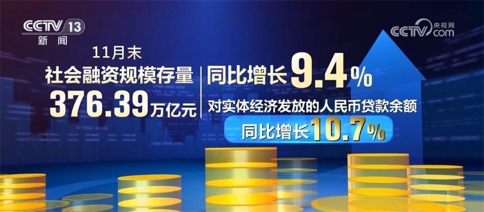 11月末社會(huì)融資規(guī)模存量為376.39萬(wàn)億元,同比增長(zhǎng)9.4%。其中,對(duì)實(shí)體經(jīng)濟(jì)發(fā)放的人民幣貸款余額同比增長(zhǎng)10.7%。11月份社會(huì)融資規(guī)模增量為2.45萬(wàn)億元,比上年同期多4556億元。