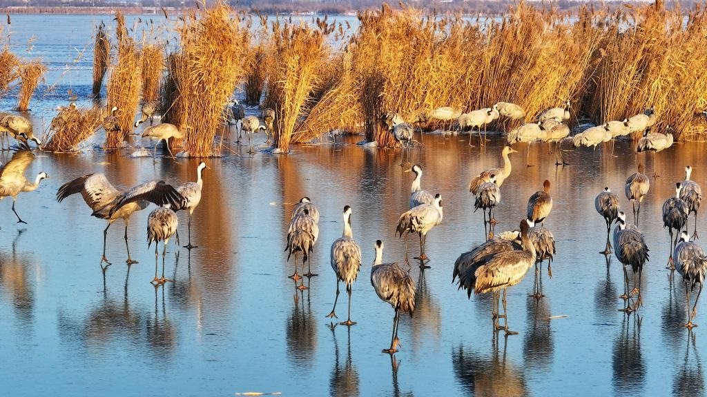“12月初開(kāi)始,鶴群陸續(xù)飛臨衡水湖。目前正處于候鳥(niǎo)越冬期,已有60余種、5萬(wàn)余只候鳥(niǎo)飛到衡水湖越冬?!焙馑?guó)家級(jí)自然保護(hù)區(qū)資源保護(hù)局濕地生態(tài)監(jiān)測(cè)科科長(zhǎng)張余廣說(shuō)。