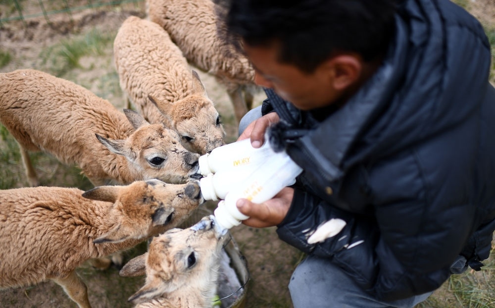 青海三江源國家公園可可西里管理處索南達(dá)杰保護(hù)站隊員才仁多杰在給被救助的藏羚羊幼仔喂奶(7月28日攝)。