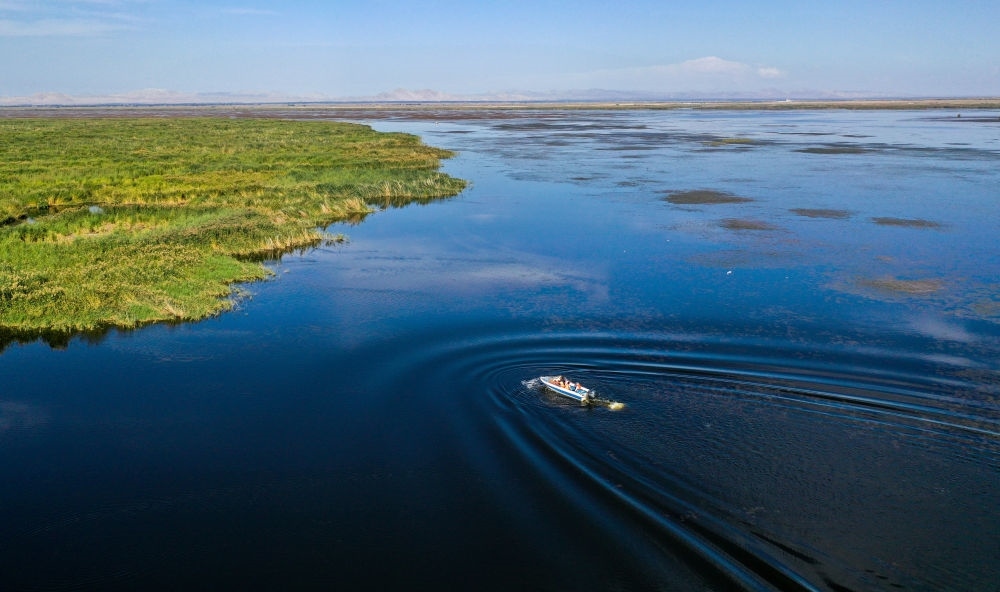 9月15日,在內(nèi)蒙古烏梁素海湖面上,河湖濕地水環(huán)境保護(hù)與修復(fù)技術(shù)研究團(tuán)隊成員乘坐快艇去采集湖水樣本(無人機(jī)照片)。