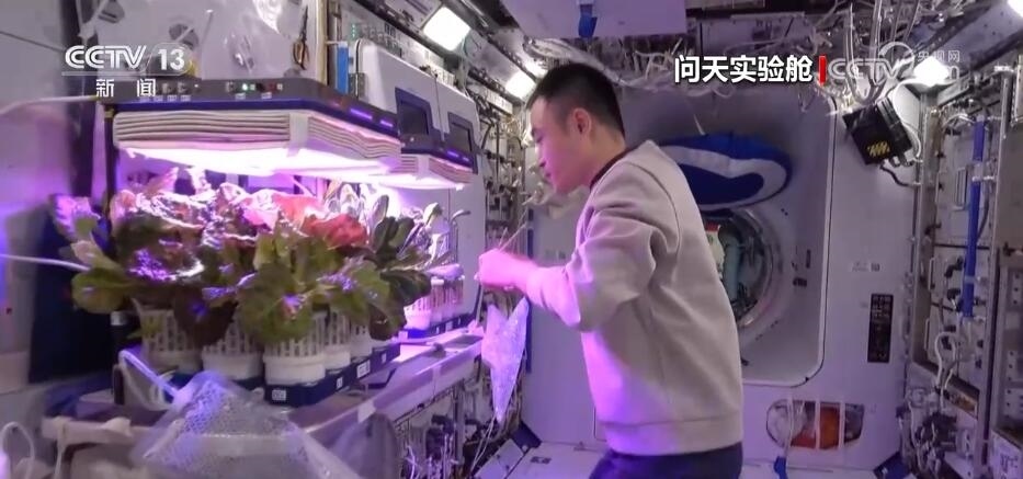 航天員 唐勝杰:你好,我正在對(duì)我們的櫻桃番茄進(jìn)行授粉。因?yàn)樘諞](méi)有小蜜蜂,我就是那只小蜜蜂。大家看一看,這是我們的太空蔬菜,神十七乘組在“太空出差”期間,我們的太空菜園變得更大了,大家看看我們的蔬菜是不是長(zhǎng)勢(shì)喜人?今天是新年的第一天,江新林為我們準(zhǔn)備了營(yíng)養(yǎng)豐盛的太空午餐,但是我覺(jué)得今天應(yīng)該再增加一點(diǎn)綠色的、新鮮的蔬菜,午餐就會(huì)變得更豐盛了。大家可以看一看,看看我們的櫻桃番茄。誒,拿這兩杯,今天中午我們就吃這兩杯。