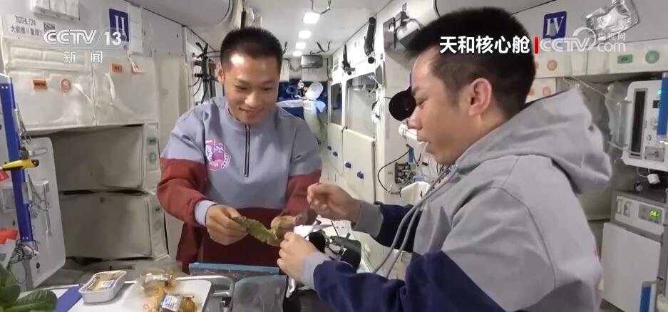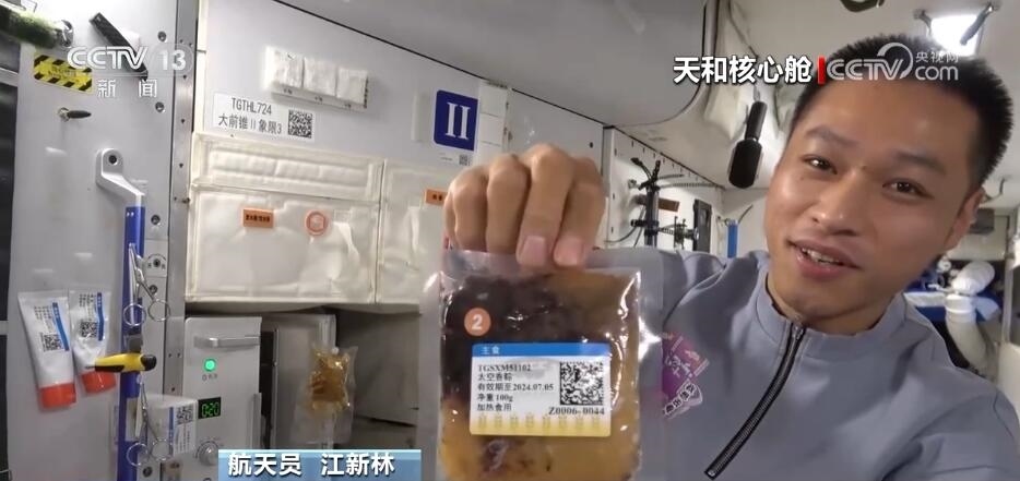 航天員 江新林:我是今天的太空美食家,讓我?guī)ьI(lǐng)大家一起來(lái)探索發(fā)現(xiàn)今天的太空美食。我們先看一下主食,熱乎乎的,看看里面都有什么吧,有01最?lèi)?ài)吃的白米飯,小心燙哦,02愛(ài)吃的面條,我的炒飯。好了,把它粘在餐桌上。然后再讓我們看看我為他們準(zhǔn)備的驚喜??纯催@是什么?這是我們冬至特意結(jié)余的餃子,還有蔬菜副食。地面上的工作人員考慮得特別周到,按照個(gè)人的口味為我們準(zhǔn)備了美味的食品,而且將它們塑封包裝,給我們節(jié)余時(shí)間的時(shí)候又保證它的口味。這是網(wǎng)紅太空香粽,大家印象比較深刻吧,還有這個(gè)年糕也是特別好吃、特別美味,還有紅燴豬排,保證有足夠的蛋白質(zhì)攝入量。很豐盛。請(qǐng)看這里,我們特意留了一些新鮮的水果,看看都有什么吧,有美味的蘋(píng)果,還有葡萄,大家這個(gè)都特別愛(ài)吃,我們?nèi)齻€(gè)在一起分享一下。