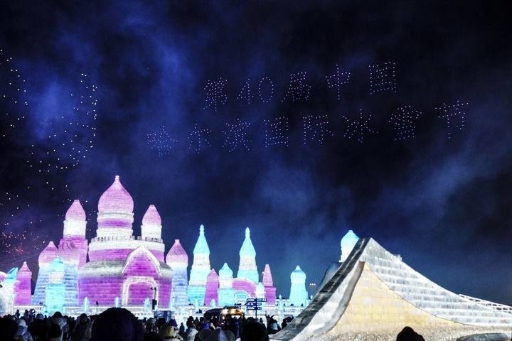 2024年1月5日,在哈爾濱冰雪大世界園區(qū),游客觀看哈爾濱國(guó)際冰雪節(jié)開(kāi)幕式上的無(wú)人機(jī)表演。新華社記者 王建威 攝