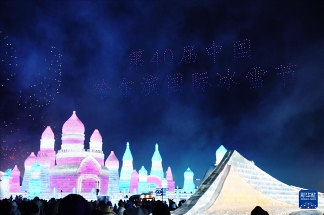 1月5日,在哈爾濱冰雪大世界園區(qū),游客在觀看哈爾濱國(guó)際冰雪節(jié)開幕式上的無人機(jī)表演。當(dāng)日,第40屆中國(guó)·哈爾濱國(guó)際冰雪節(jié)開幕,吸引眾多游客。新華社記者 王建威 攝