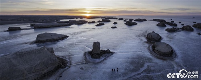 青海海西,大柴旦行委西臺(tái)地區(qū),水上雅丹冬季日出風(fēng)光。