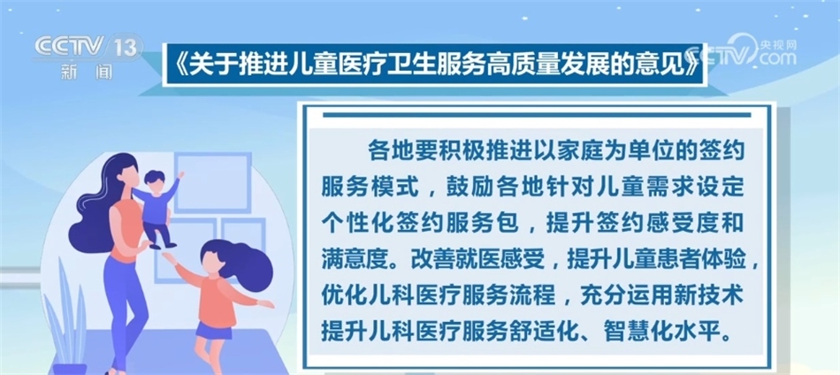 《意見(jiàn)》要求,各地要積極推進(jìn)以家庭為單位的簽約服務(wù)模式,鼓勵(lì)各地針對(duì)兒童需求設(shè)定個(gè)性化簽約服務(wù)包,提升簽約感受度和滿意度。改善就醫(yī)感受,提升兒童患者體驗(yàn),優(yōu)化兒科醫(yī)療服務(wù)流程,充分運(yùn)用新技術(shù)提升兒科醫(yī)療服務(wù)舒適化、智慧化水平。