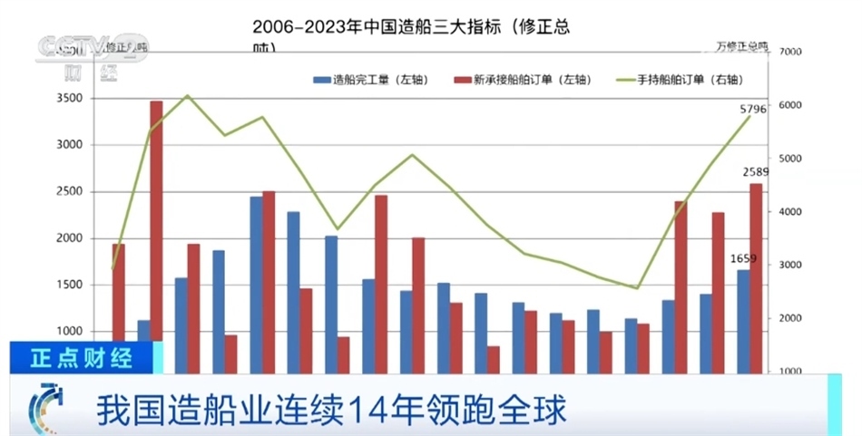 總臺(tái)央視記者 吳天白:在2023年中國造船業(yè)統(tǒng)計(jì)數(shù)據(jù)中,我們還可以看到三大指標(biāo)占國際市場(chǎng)份額分別是50.2%、66.6%和55.0%,首次全部超過50%。從這幾張數(shù)據(jù)圖中,我們可以看出,我國高技術(shù)、高價(jià)值船型的新接訂單量創(chuàng)2008年以來新高,在這里我們可以看到中國新接綠色動(dòng)力船舶訂單占國際市場(chǎng)的份額也是連年增長(zhǎng),2023年全年已經(jīng)達(dá)到了57%。這也表明了未來全球一半以上的新能源船都將產(chǎn)自中國。