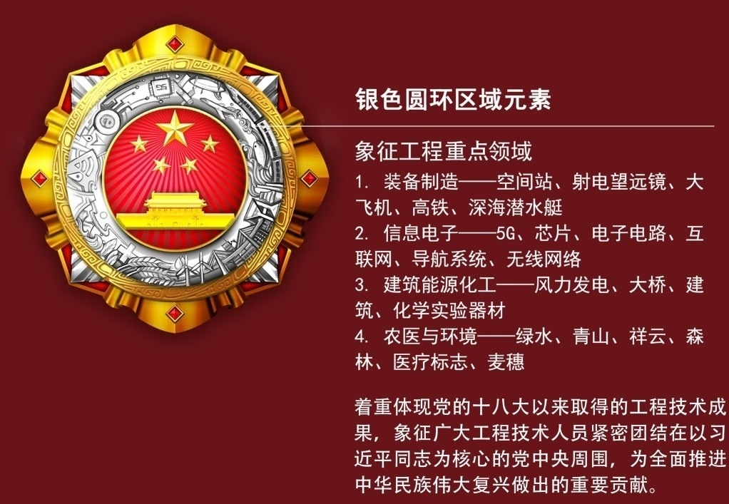 獎章中的工程技術元素選取的是我國具有代表性的工程技術成果,如高速鐵路、5G、港珠澳大橋、雜交水稻等,象征我國科技創(chuàng)新事業(yè)發(fā)生的歷史性、整體性、格局性重大變化。