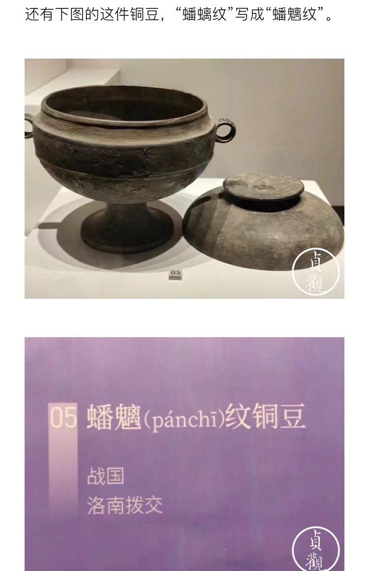 文章稱,秦漢館中很多展品不僅沒(méi)有英文標(biāo)識(shí),甚至連展品的基本信息都不全,有的文物名稱也被標(biāo)錯(cuò),如:“鷹獸相搏紋飾銅牌飾” 被誤寫(xiě)為“銅鷹獸權(quán)博牌飾”;介紹一件銅豆的展品信息中,“蟠螭紋”誤寫(xiě)成“蟠魑紋”。