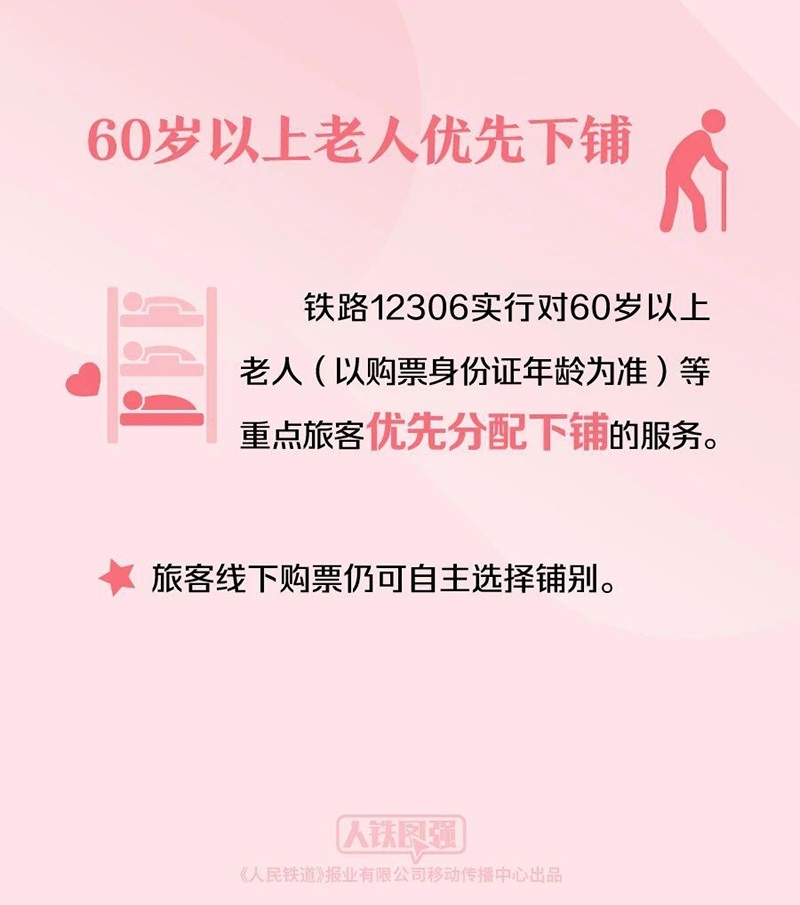 在票量充足的情況下,系統(tǒng)自動(dòng)識(shí)別60歲以上的老年旅客并優(yōu)先安排下鋪。如果是多人同行一份訂單,系統(tǒng)也會(huì)自動(dòng)分配相鄰鋪位。