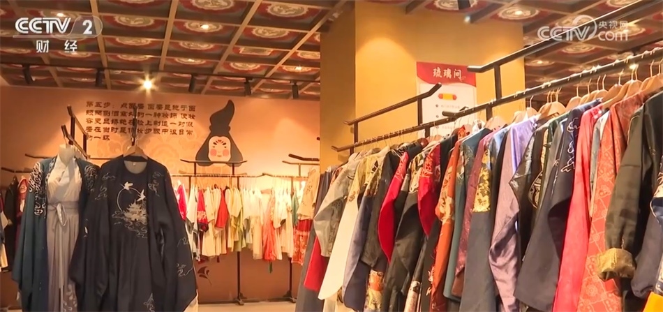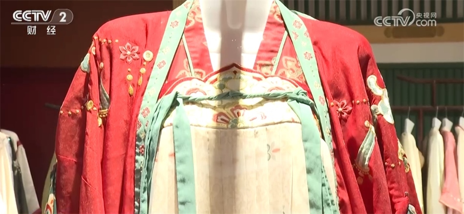 總臺記者 秦祎:我旁邊的這件就是店內最受歡迎的唐裝之一——花想容,這件衣服里面是一件唐裝的基礎款造型齊胸襦裙,披上外披則是貴妃造型,如果擔心天氣冷可以像我一樣加上斗篷。