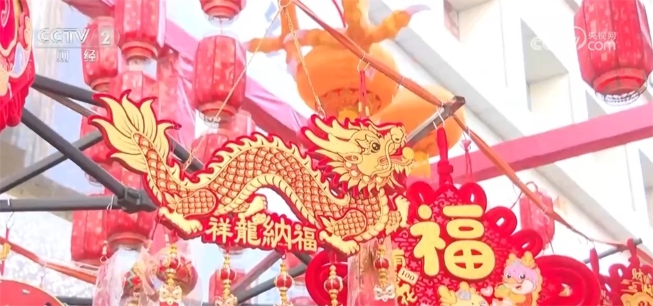 年集現(xiàn)場(chǎng),不少商家還將帶有龍?jiān)氐男履晷∥锛[放在醒目位置,包括福字貼、紅燈籠、龍玩偶、新年擺件等,無(wú)數(shù)個(gè)紅彤彤的小掛件營(yíng)造出濃厚的新年氛圍,吸引不少市民購(gòu)買(mǎi)。