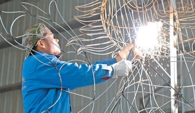 自貢龍騰文化藝術有限公司生產(chǎn)車間,焊花飛濺,一條中國龍的骨架正在成形。另一側(cè),裱糊工將龍鱗拼貼上色,彩燈漸顯神韻。
