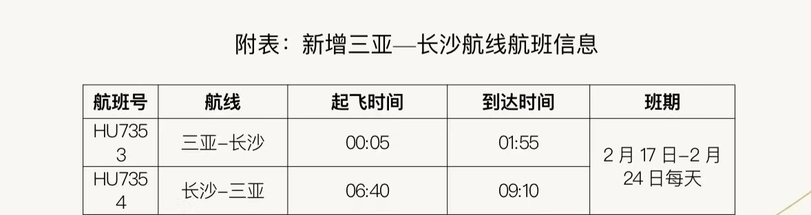 據(jù)悉,在民航局、海南省交通廳的支持下,海南航空積極協(xié)調(diào)申請加班計劃。2月17日至24日期間,海南航空每日新增三亞—長沙往返航班。去程航班HU7353,從三亞起飛時間為凌晨 00:05,到達長沙黃花國際機場時間為01:55;返程航班HU7354,從長沙起飛時間為06:40,到達三亞鳳凰國際機場時間為09:10,以上航班信息以實際查詢?yōu)闇省B每涂赏ㄟ^海南航空官網(wǎng)及APP、微信公眾號及小程序、服務熱線95339、各直屬售票處及授權代理購買機票。