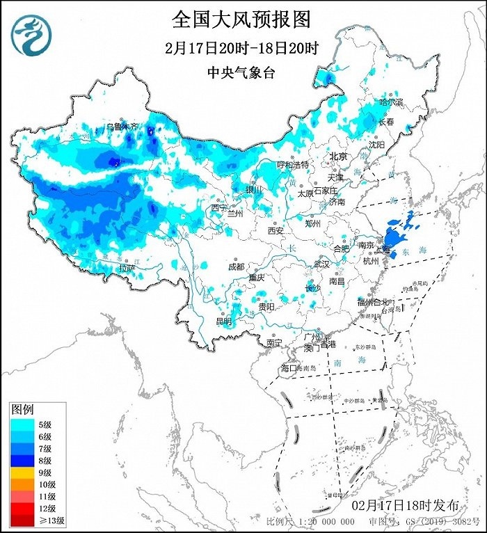 預(yù)計,2月17日20時至18日20時,新疆北疆東部和南疆盆地、西藏中西部、青海西部和北部、甘肅河西、內(nèi)蒙古中西部、吉林西部等地將有5~7級、陣風(fēng)8~9級的大風(fēng)。