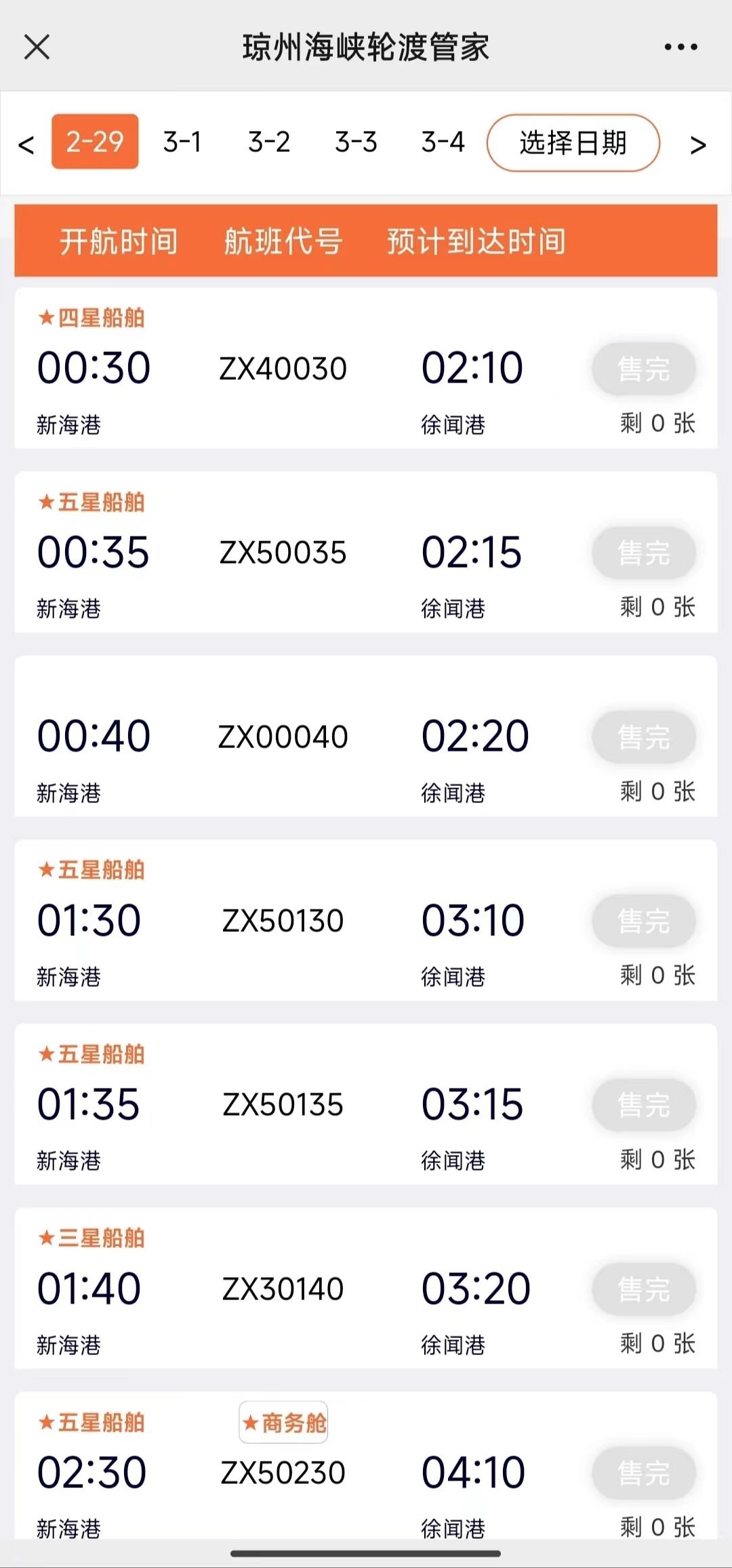 澎湃新聞記者17日上午查詢官方購票平臺“瓊州海峽輪渡管家”發(fā)現,實時數據顯示,??谛潞8壑列炻劯鄣男履茉窜囕喍善?,2月17日至2月29日均已售罄。