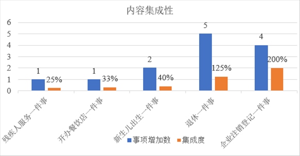 從內(nèi)容集成度看,5項(xiàng)相關(guān)“一件事”的事項(xiàng)集成比例均有不同程度提升?!皻埣踩朔?wù)一件事”增加1個(gè)事項(xiàng),集成度提升25%?!伴_辦餐飲店一件事”增加1個(gè)事項(xiàng),集成度提升33%?!靶律鷥撼錾患隆痹黾?個(gè)事項(xiàng),集成度提升40%?!巴诵菀患隆痹黾?個(gè)事項(xiàng),集成度提升125%。“企業(yè)注銷登記一件事”增加4個(gè)事項(xiàng),集成度提升200%。
