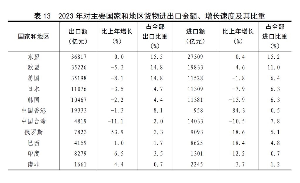 全年貨物進(jìn)出口總額417568億元,比上年增長0.2%。其中,出口237726億元,增長0.6%;進(jìn)口179842億元,下降0.3%。貨物進(jìn)出口順差57883億元,比上年增加1938億元。對(duì)共建“一帶一路”[46]國家進(jìn)出口額194719億元,比上年增長2.8%。其中,出口107314億元,增長6.9%;進(jìn)口87405億元,下降1.9%。對(duì)《區(qū)域全面經(jīng)濟(jì)伙伴關(guān)系協(xié)定》(RCEP)其他成員國[47]進(jìn)出口額125967億元,比上年下降1.6%。民營企業(yè)進(jìn)出口額223601億元,比上年增長6.3%,占進(jìn)出口總額比重為53.5%。