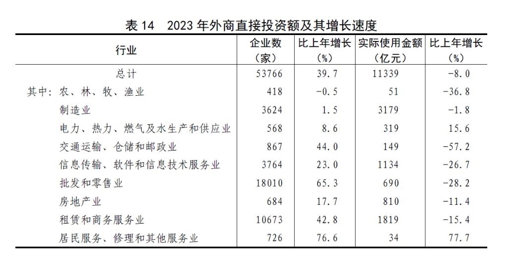 全年外商直接投資新設(shè)立企業(yè)53766家,比上年增長39.7%。實(shí)際使用外商直接投資額11339億元,下降8.0%,折1633億美元,下降13.7%。其中,共建“一帶一路”國家對(duì)華直接投資(含通過部分自由港對(duì)華投資)新設(shè)立企業(yè)13649家,增長82.7%;對(duì)華直接投資額1221億元,下降11.4%,折176億美元,下降16.7%。高技術(shù)產(chǎn)業(yè)實(shí)際使用外資額4233億元,下降4.9%,折610億美元,下降10.8%。