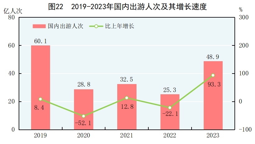 全年國內(nèi)出游48.9億人次,比上年增長93.3%。其中,城鎮(zhèn)居民國內(nèi)出游37.6億人次,增長94.9%;農(nóng)村居民國內(nèi)出游11.3億人次,增長88.5%。國內(nèi)游客出游總花費(fèi)49133億元,增長140.3%。其中,城鎮(zhèn)居民出游花費(fèi)41781億元,增長147.5%;農(nóng)村居民出游花費(fèi)7353億元,增長106.4%。入境游客8203萬人次,其中外國人1378萬人次,香港、澳門和臺(tái)灣同胞6824萬人次。入境游客總花費(fèi)530億美元。國內(nèi)居民出境10096萬人次,其中因私出境9684萬人次,赴港澳臺(tái)出境7704萬人次。