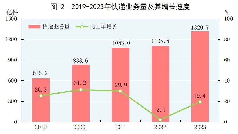 全年完成郵政行業(yè)寄遞業(yè)務(wù)總量[29]1625億件,比上年增長16.8%。郵政業(yè)完成郵政函件業(yè)務(wù)9.7億件,包裹業(yè)務(wù)0.2億件,快遞業(yè)務(wù)量1320.7億件,快遞業(yè)務(wù)收入12074億元。全年完成電信業(yè)務(wù)總量[30]18327億元,比上年增長16.8%。年末移動(dòng)電話基站數(shù)[31]1162萬個(gè),其中4G基站629萬個(gè),5G基站338萬個(gè)。全國電話用戶總數(shù)189992萬戶,其中移動(dòng)電話用戶172660萬戶。移動(dòng)電話普及率為122.5部/百人。固定互聯(lián)網(wǎng)寬帶接入用戶[32]63631萬戶,比上年末增加4666萬戶,其中100M速率及以上的寬帶接入用戶[33]60136萬戶,增加4756萬戶。蜂窩物聯(lián)網(wǎng)終端用戶[34]23.32億戶,增加4.88億戶?;ヂ?lián)網(wǎng)上網(wǎng)人數(shù)10.92億人,其中手機(jī)上網(wǎng)人數(shù)10.91億人?;ヂ?lián)網(wǎng)普及率為77.5%,其中農(nóng)村地區(qū)互聯(lián)網(wǎng)普及率為66.5%。全年移動(dòng)互聯(lián)網(wǎng)用戶接入流量3015億GB,比上年增長15.2%。軟件和信息技術(shù)服務(wù)業(yè)[35]完成軟件業(yè)務(wù)收入123258億元,比上年增長13.4%。