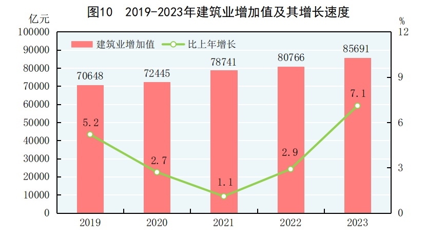 全年建筑業(yè)增加值85691億元,比上年增長7.1%。全國具有資質(zhì)等級(jí)的總承包和專業(yè)承包建筑業(yè)企業(yè)利潤8326億元,比上年增長[27]0.2%,其中國有控股企業(yè)4019億元,增長4.3%。