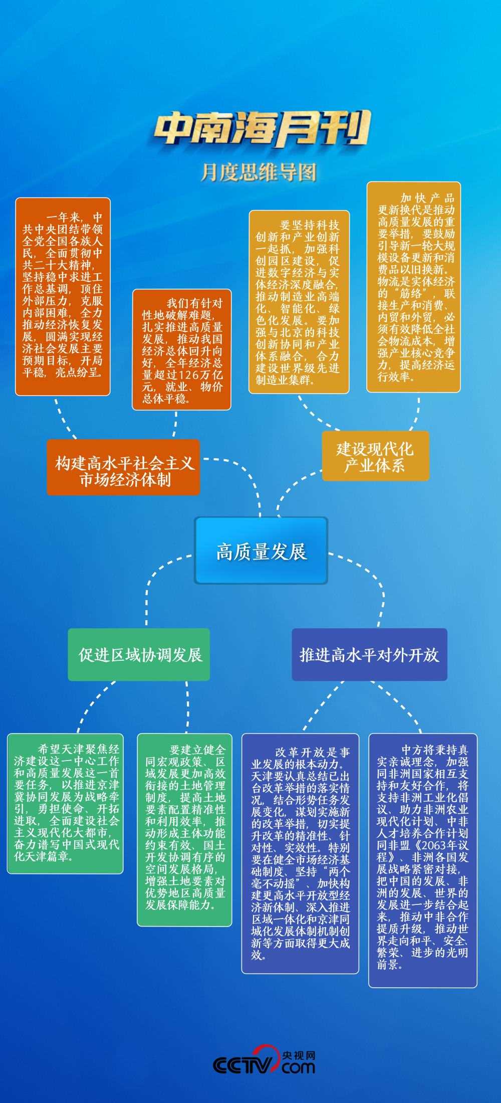 在同黨外人士共迎新春時,總書記回顧我國一年來構建高水平社會主義市場經濟體制取得的突出亮點;在全國先進制造研發(fā)基地、環(huán)渤海地區(qū)的經濟中心天津,總書記為建設現代化產業(yè)體系和促進區(qū)域協(xié)調發(fā)展指明方向;在同塞拉利昂總統(tǒng)會談時,習主席闡釋推進高水平對外開放的思路和舉措……全面推動高質量發(fā)展的理念貫穿始終。