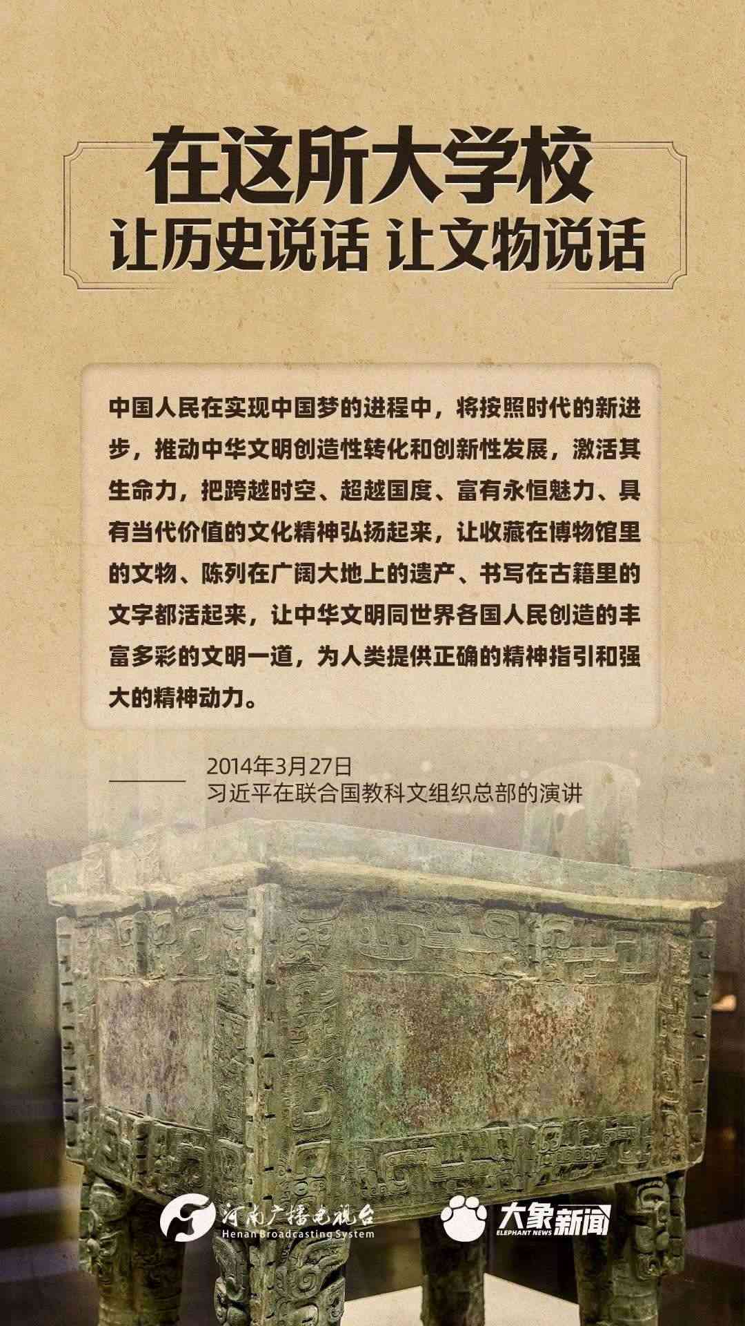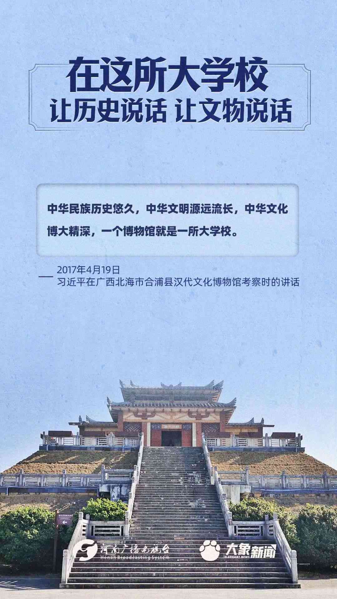 習(xí)近平總書記一直高度重視博物館工作,多次作出重要講話,強(qiáng)調(diào)“一個(gè)博物院就是一所大學(xué)校”,指出“讓歷史說話,讓文物說話”,要求“守護(hù)好、傳承好、展示好中華文明優(yōu)秀成果”等等,金句連連。大象新聞進(jìn)行了認(rèn)真梳理,邀您一起學(xué)習(xí)。