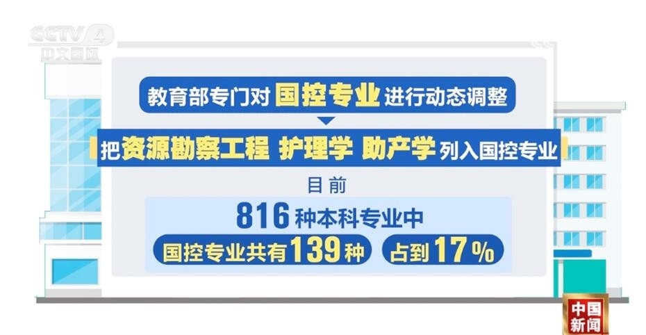 此次教育部專門對國控專業(yè)進行了動態(tài)調(diào)整,把資源勘察工程、護理學、助產(chǎn)學列入了國控專業(yè)。目前,816種本科專業(yè)中,國控專業(yè)共有139種,占到17%。未來,國控專業(yè)范圍還將進行“有進有出”的動態(tài)調(diào)整。